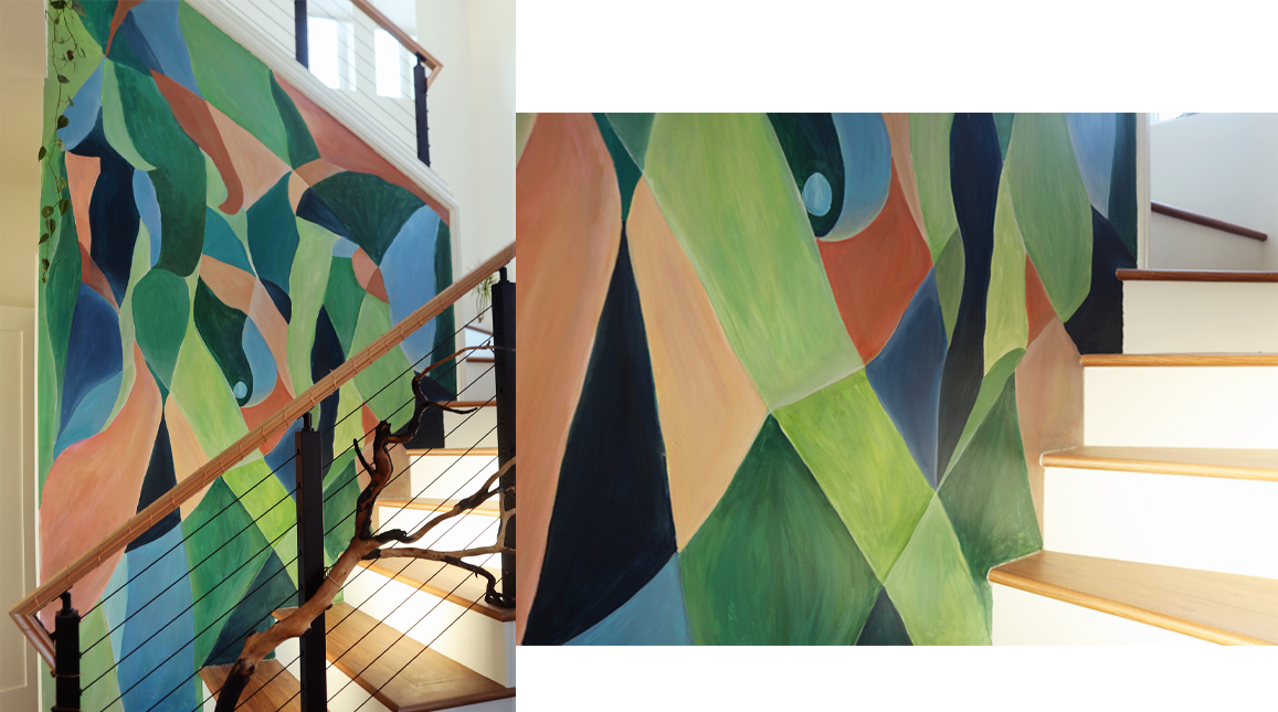 This stairway mural was designed to add vibrancy and color as well as a sense of calm and cohesion with the existing space and palette. Simple figures are abstracted into blocks of color and blended with organic shapes.